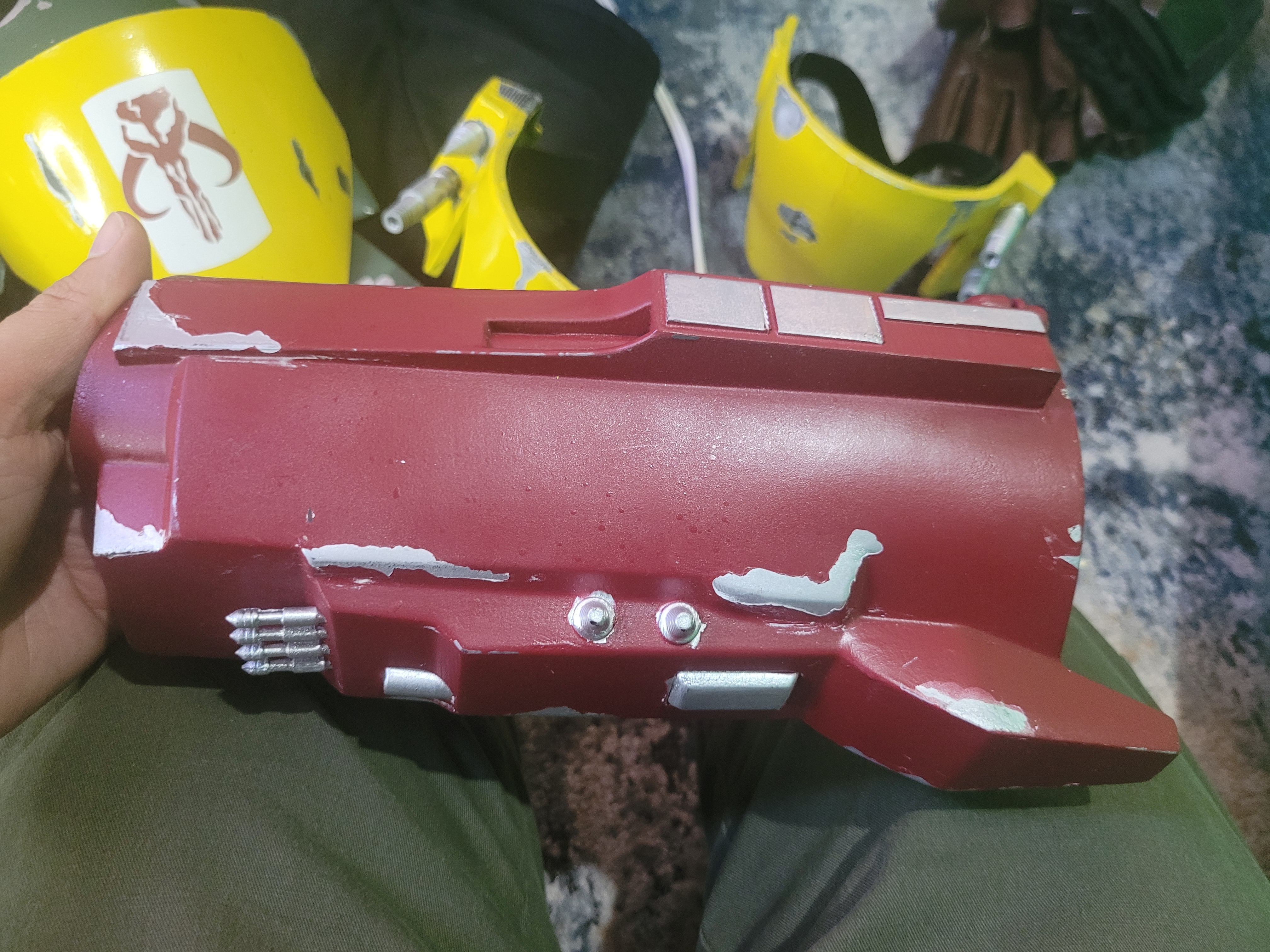 Parte del misil pintada en negro, holdster, cinto de cuerdas, botas nuevas, detalles negros en lado derecho del casco.