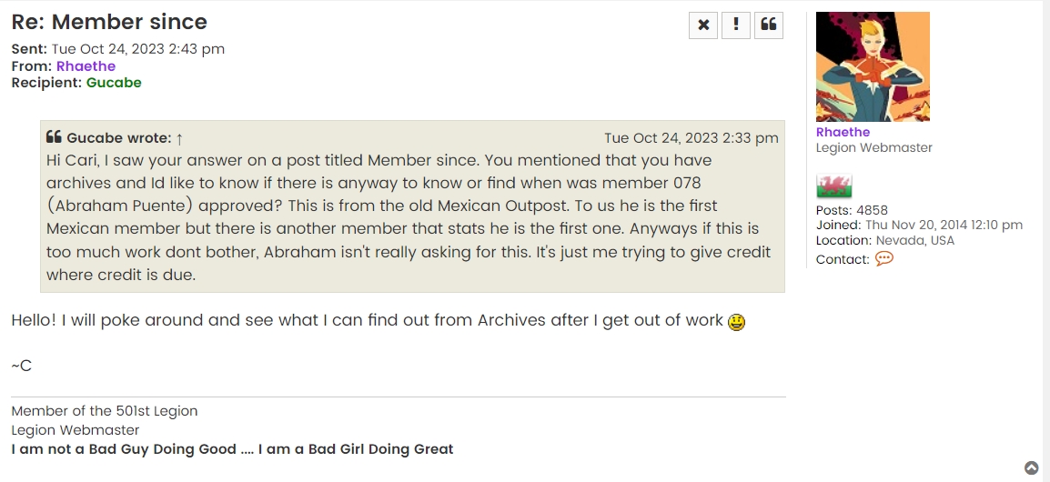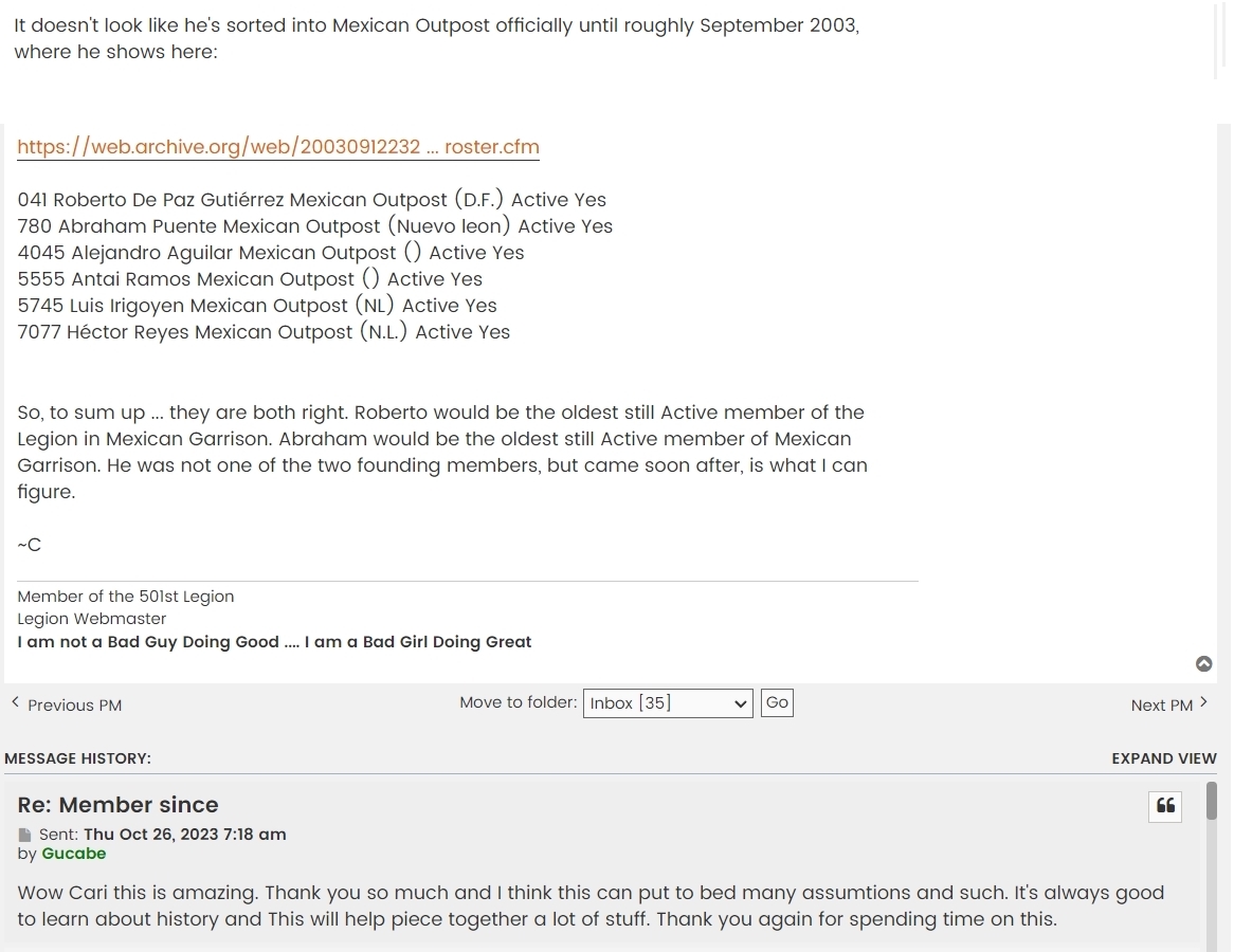 Primero que nada el primer miembro Mexicano registrado en la Legión fue Roberto de Paz con el número 041, sin embargo no estaba afiliado a ninguna unidad ya que en aquel entonces no existía el Outpost México. Roberto fue dado de alta entre Marzo 31 y Septiembre 21 de 2002, sin embargo Cari no pudo corroborar la fecha que Roberto tiene en su Perfil (Agosto 1 de 2002) donde formalmente le dan su aprobación.