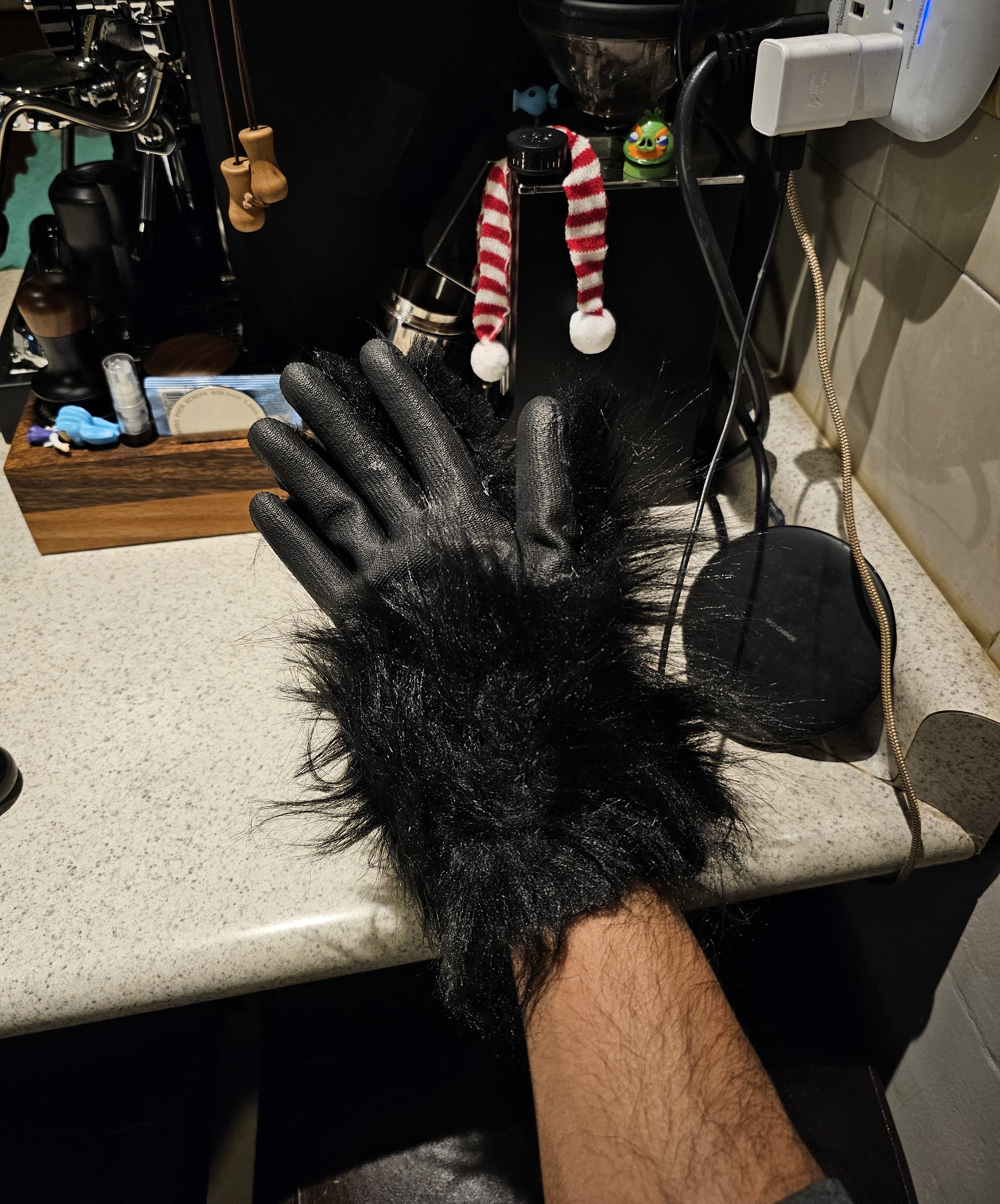 Después hice los guantes, conseguí tela con peluchito y los guantes con palma de plástico como dice el crl, recorté y pegué con silicón caliente, estos sí quedaron muy padres jsjs