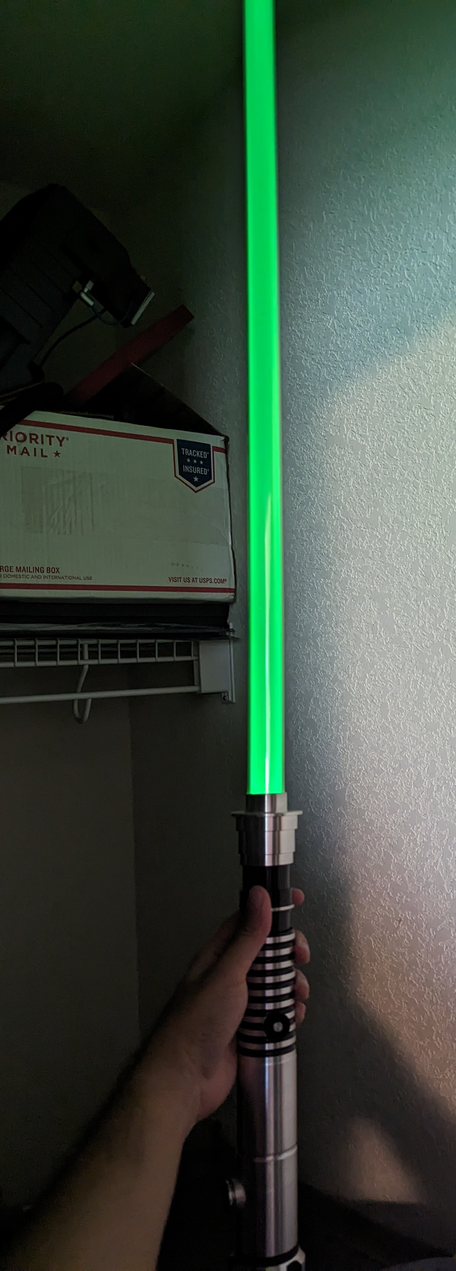 Vengo a ofrecerles mi sable de ultrasabers, viene con el accesorio de covertec wheel para poder colgarlo en un covertec clip. El sistema de iluminado es muy sencillo, un solo LED verde, no cambia de color ni tiene sonido. Tiene ranuras y malla para agregarle sistema de sonido, aparte de que si tiene espacio de sobra por dentro.