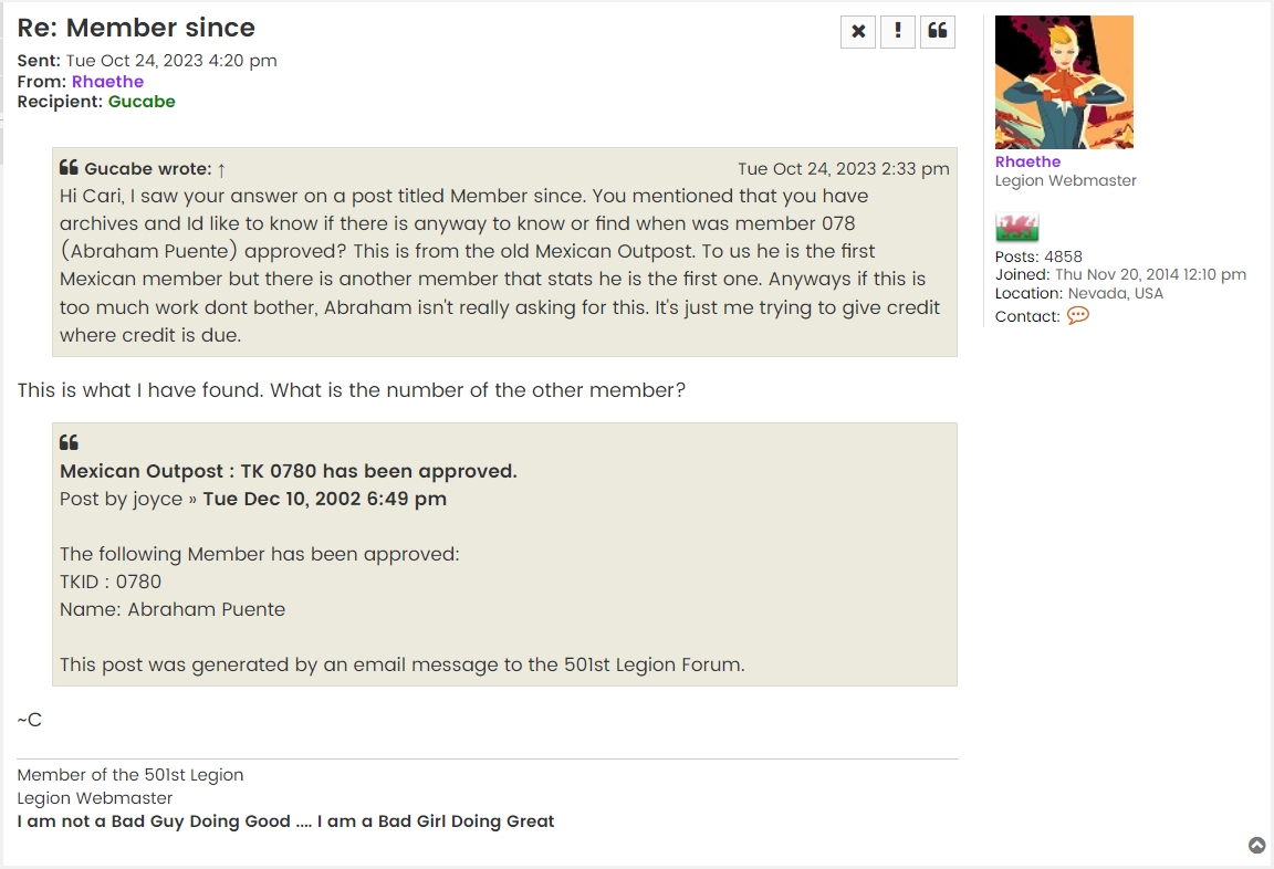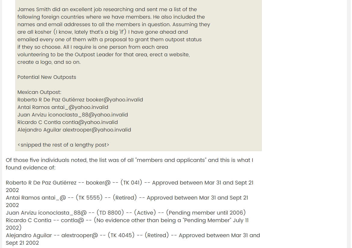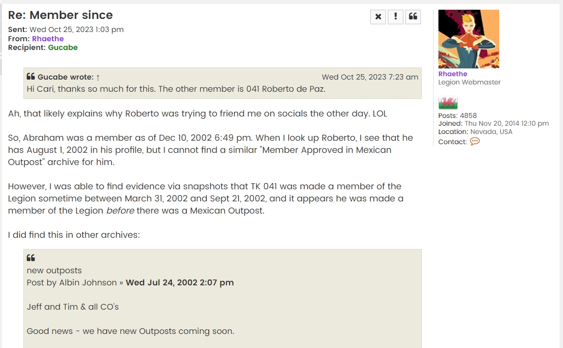 Primero que nada el primer miembro Mexicano registrado en la Legión fue Roberto de Paz con el número 041, sin embargo no estaba afiliado a ninguna unidad ya que en aquel entonces no existía el Outpost México. Roberto fue dado de alta entre Marzo 31 y Septiembre 21 de 2002, sin embargo Cari no pudo corroborar la fecha que Roberto tiene en su Perfil (Agosto 1 de 2002) donde formalmente le dan su aprobación.