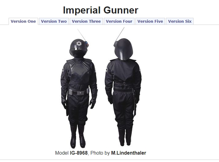 Imperial Navy trooper, que es un tie pilot reserve con casco navy: Imperial navy trooper dress uniform v2, que es un Imperial warrant officer v3 con casco navy: Imperial navy trooper dress uniform v3, que es un Imperial warrant officer v2 con casco navy: Es un total de 10 trajes diferentes combinando un Tie pilot con un Imperial security officer y un casco Navy.