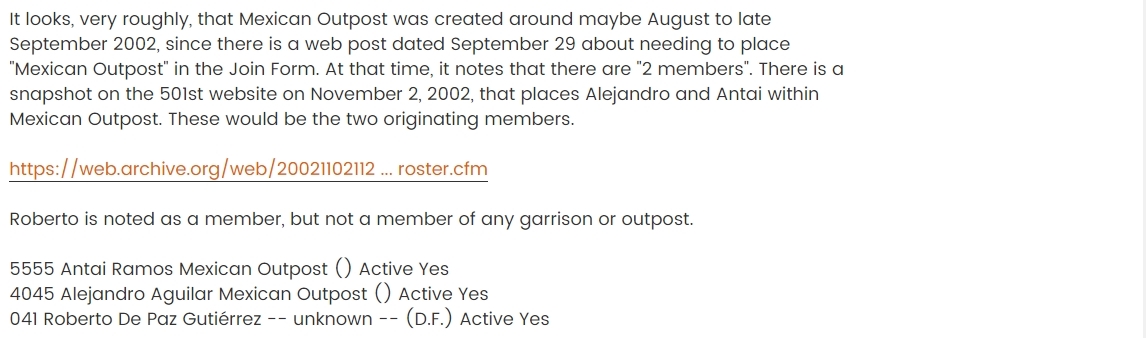 Primero que nada el primer miembro Mexicano registrado en la Legión fue Roberto de Paz con el número 041, sin embargo no estaba afiliado a ninguna unidad ya que en aquel entonces no existía el Outpost México. Roberto fue dado de alta entre Marzo 31 y Septiembre 21 de 2002, sin embargo Cari no pudo corroborar la fecha que Roberto tiene en su Perfil (Agosto 1 de 2002) donde formalmente le dan su aprobación.